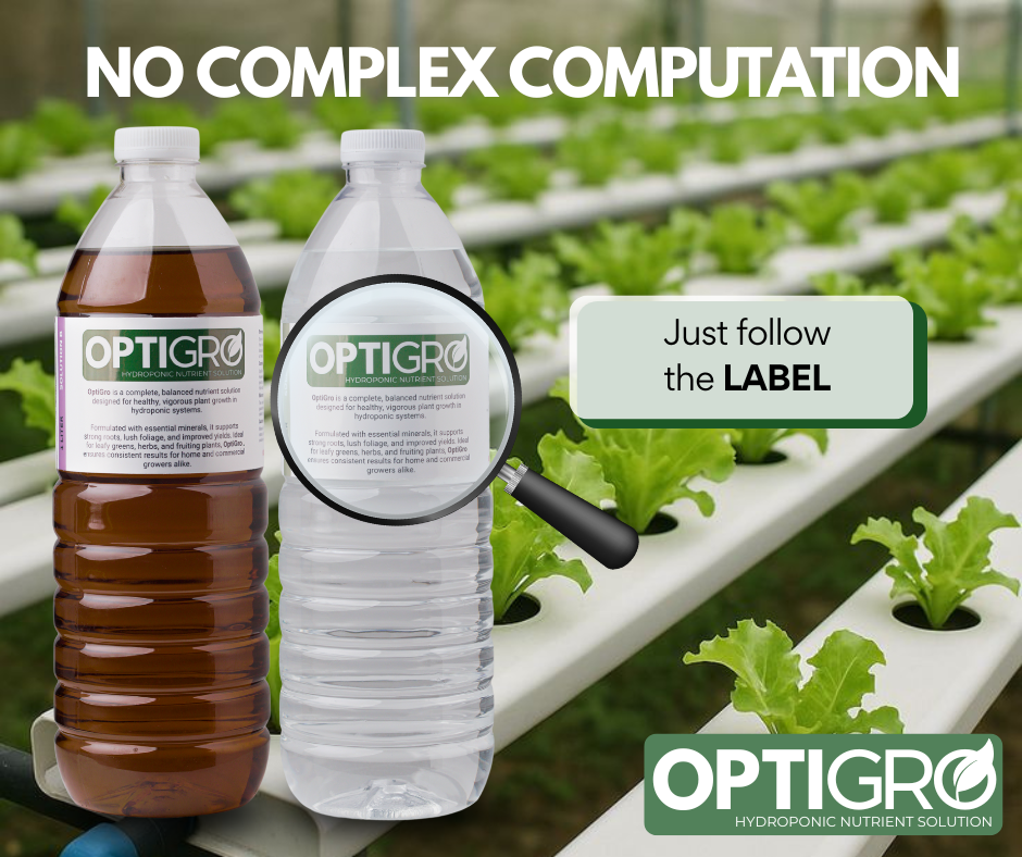 No complex calculations needed. Just follow the label and you're done. OptiGro removes the math so you spend less time preparing nutrients and more time caring for your plants. Mas konting oras sa paghahalo, mas maraming oras sa pag-aalaga.